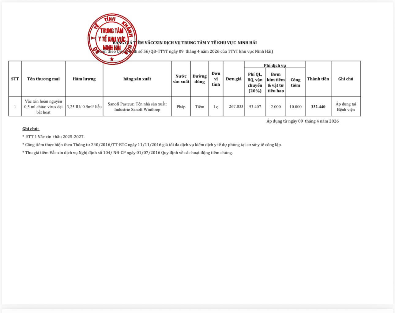 Giá dịch vụ Tiêm Vắc xin tại Trung tâm y tế Khu vực Ninh Hải năm 2026